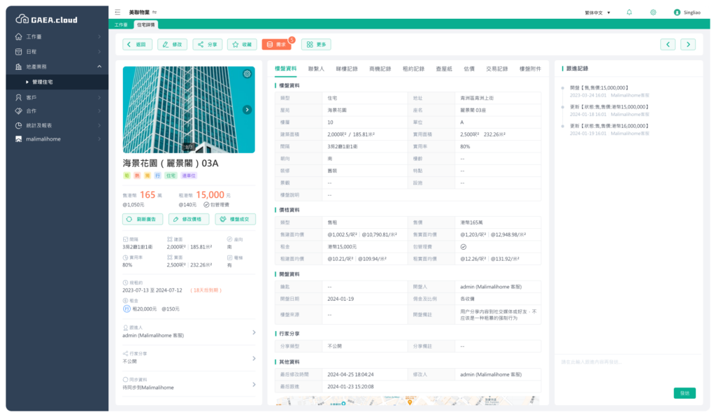 GAEA.cloud 物業管理系統 一个便捷, 功能丰富, 又能同时帮你抢生意的云端地产中介管理系统 立即登錄 幫您管理好樓盤 系統提供樓盤全生命週期管理,智能記錄狀態變更、價格調整及跟進記錄,支援多端同步更新;可視化時間軸清晰呈現歷史動態,手機拍照即時上傳,電腦智能歸檔,確保資訊準確可溯,提升團隊協作效率 讓您有條不紊地管理樓盤資產 可管理住宅、商業、車位,記錄租約、估價、交易及睇樓信息,方便用戶快速查閱租約狀態、參考歷史估價、跟蹤交易與睇樓進度,並設有提醒功能,還支持上傳、查詢及分享查屋紙資料 滿足大中小型團隊的權限控制需要 支持細粒度權限控制,可授權不同操作,設定僅跟進人可修改或查看相關樓盤資料,可根據用戶組別分配查看與修改權限,確保數據安全與管理靈活性 業主資訊保護 可控制用戶是否能查看業主資訊,並追蹤查看次數,同時支持隱藏特定樓盤的業主資料,確保數據安全與隱私管理。 樓盤資料跟進及追踪 可完整記錄並追蹤樓盤的每一次修改,按時間順序清晰呈現開盤、成交、改價及跟進等關鍵節點,讓您隨時掌握最新動態和完整歷史記錄 拍照、拍片更方便 即時上傳 外出時,您可以直接用手機拍攝樓盤的照片和影片,並立即上傳至系統,確保資料即時更新。無論是現場實況、房屋細節或周邊環境,都能快速記錄並同步,方便團隊隨時查看和跟進,提升工作效率. 聯動手機上傳 透過電腦版AirUpload功能,用戶只需在網頁點擊上傳按鈕,即可自動連動手機端彈出照片/影片選擇界面,實現跨設備快速傳輸。該功能簡化了資料上傳流程,無需數據線或第三方工具,讓電腦和手機無縫銜接,大幅提升工作效率. 幫您管理好客戶 以客戶為中心 只需一鍵點擊,即可全面掌握客戶動態,包括其放售/放租需求、購買/承租意向、潛在商機、租約詳情及睇樓記錄等完整資訊,讓您快速回應客戶需求,提升成交效率 快速導入和管理客戶資料 新增客戶就像儲存手機聯絡人一樣簡單,支援直接從通訊錄導入資料,更提供智能合併功能,自動識別重複客戶,避免資料重複輸入,讓客戶管理更高效便捷 CRM功能 提供完整的客戶管理功能,包含詳細追蹤客戶資料修改和跟進記錄,支持多用戶協作分配,提供共享/獨佔/混合三種隔離模式,並通過智能商機管理(分類潛在客戶、追蹤溝通進度、預測成交金額)顯著提升成交率 幫您管理好租約 所有租約集中管理 集中管理所有租約,智能提醒即將到期合約,讓您輕鬆掌握續約時機,避免遺漏關鍵日期,提升租約管理效率 跟進租客事項 系統自動按時間順序整理租客服務記錄,清晰呈現每項跟進事項,讓您隨時掌握服務進度,確保租約管理高效有序 提前提醒您租約到期 系統智能推送租約到期提醒,通過訊息通知和專屬界面提前警示即將到期合約,助您及時安排續約事宜,避免遺漏關鍵日期 集中管理租約相關附件 系統提供租約附件集中儲存功能,合約、收據等文件統一歸檔,支持快速檢索查閱,確保重要文件安全有序管理 幫您管理好日程 GAEA.cloud為用戶提供了一個方便、集中的平臺,幫助用戶有效地安排和管理日常任務和活動,同時也提供了公司經理更好地分配任務和監控下屬工作進度的功能 日程管理 智能日程管理系統集中展示租約到期提醒、睇樓預約等所有待辦事項,讓您在一個介面輕鬆掌握各項任務進度,提升工作效率 日曆視圖 日曆視圖支援按月、週模式切換,清晰展示所有待辦事項安排,讓您輕鬆掌握日程規劃,不錯過任何重要行程 到期提醒 系統會在租約到期、睇樓預約及任務截止前自動推送提醒,確保您及時處理各項待辦事項,避免遺漏重要日程 任務分配和監控 系統支援按用戶組權限分配和查看日程任務,實現團隊工作高效分配與即時監控,確保任務進度可視化管控 商機需求自動匹配 GAEA.cloud智能匹配提醒系統為房地產從業者提供了一個便捷、高效的渠道,幫助他們更快速地找到符合客戶需求的房源,提高工作效率,並提供更好的客戶服務 專業的商機視圖 按商機階段顯示潜在客戶商機, 方便管理各個商機的洽淡進度 智能匹配客戶需求 系統根據樓盤數據和需求數據, 智能匹配, 一旦匹配成功, 則在樓盤視圖或需求視圖中, 立即出現匹配的需求或樓盤 需求跟踪 用戶可排序匹配的樓盤或需求, 幫潜在客戶進行篩選, 收到滿足需求的數據范圍 自動提醒 當有新需求或樓盤時, 系統自動匹配, 一旦匹配成功, 立即發出通知, 讓您第一時間知悉 自動宣傳推廣 深度集成澳門首選地產網MaliMaliHome 與澳門地產資訊網站MaliMaliHome進行同步合作,使得用戶可以在兩個平臺間實現數據同步,提高廣告宣傳的效果和覆蓋範圍 數據自動同步 當用戶在GAEA.cloud上修改樓盤資料時,系統會自動識別這些修改並將相應的數據同步到MaliMaliHome,確保在各個平臺上信息的一致性,減少了重複工作的時間和成本 提升廣告效益,無需額外人力維護 與MaliMaliHome同步機制省去了額外投入人力維護廣告資訊的成本,讓用戶能夠更有效地進行廣告宣傳,提升業務競爭力 建立合作同盟 可與其他公司建立更緊密的合作關係網 與其它公司建立合作關系後, 可查詢合作公司分享的樓盤資訊, 適合數間公司自行建立合作關系網絡 可設置與合作公司的資料公開程度 可跟據設置控制對方可以查看資料的深入程度, 如是否能查看具體樓層及單位 隨時隨地使用 數據